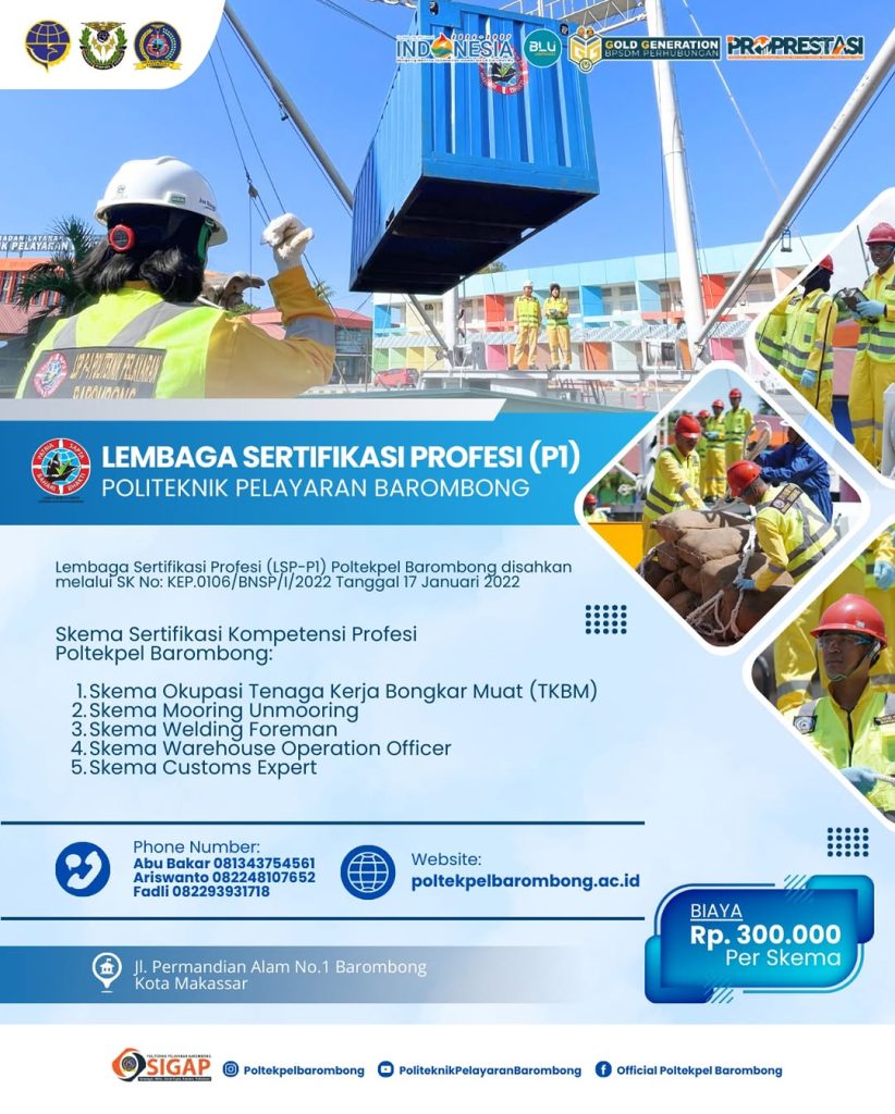 You are currently viewing Lembaga Sertifikasi Profesi (LSP-Pl) Poltekpel Barombong resmi disahkan melalui SK No: KEP.0106/BNSP/2022 pada 17 Januari 2022. Kami menawarkan skema sertifikasi kompetensi profesi untuk meningkatkan kualitas tenaga kerja di bidang pelayaran dan logistik.