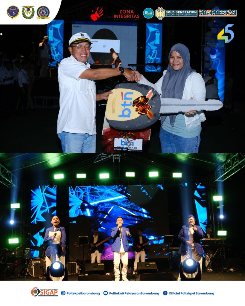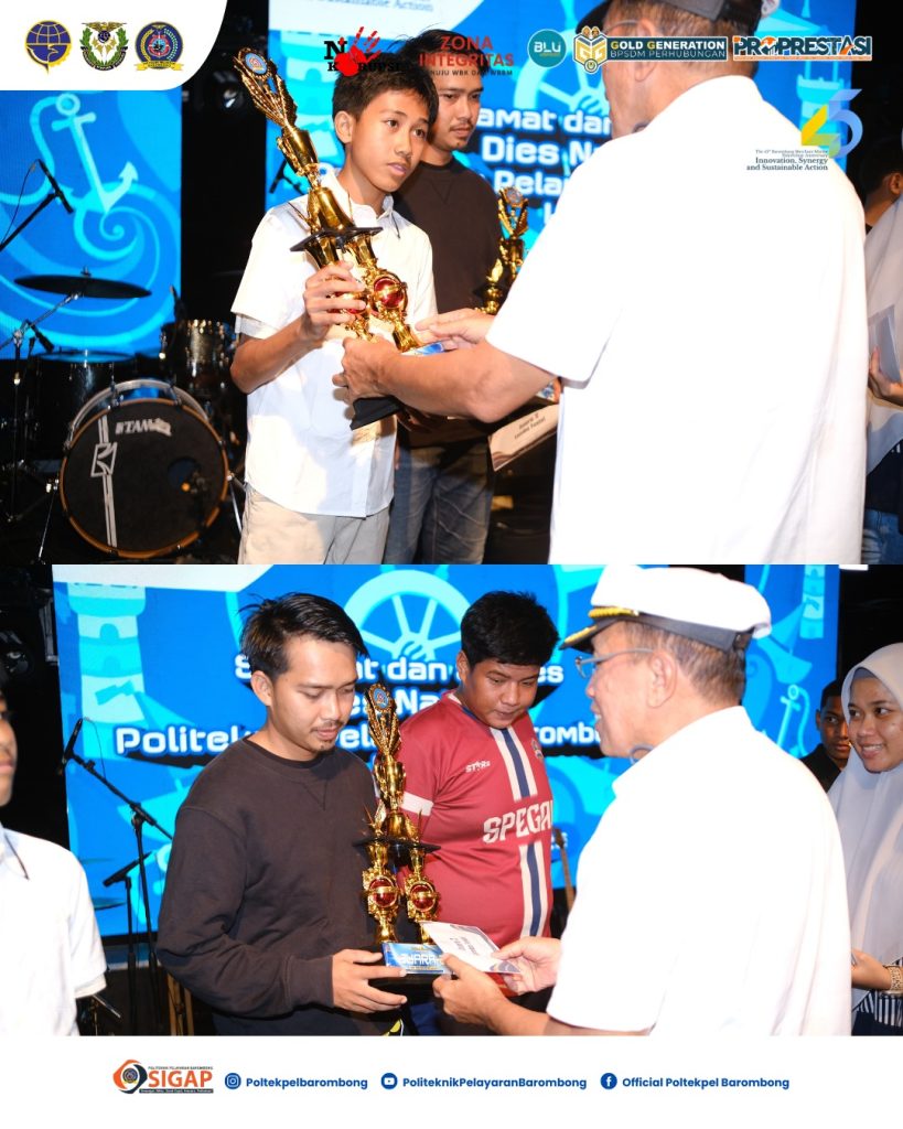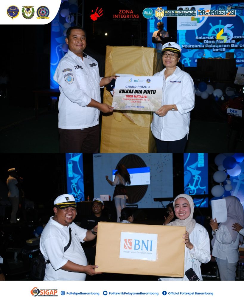 Kegiatan dilanjutkan dengan acara pembagian hadiah kepada peserta lomba yang telah memenangkan perlombaan dalam rangka Dies Natalis ke-45 tahun. Kemudian dilanjutkan dengan pemotongan kue dan tumpeng oleh Pimpinan Politeknik Pelayaran Barombong serta pemberian hadiah doorprize undian dalam rangka memeriahkan Dies Natalis ke-45 Politeknik Pelayaran Barombong.