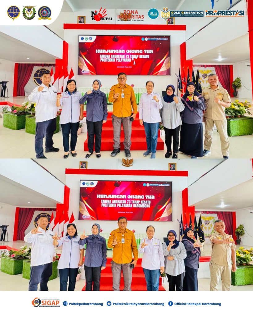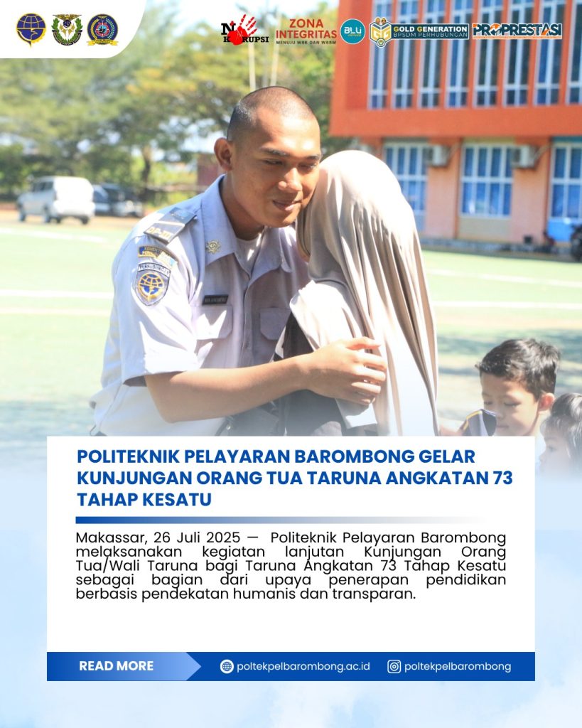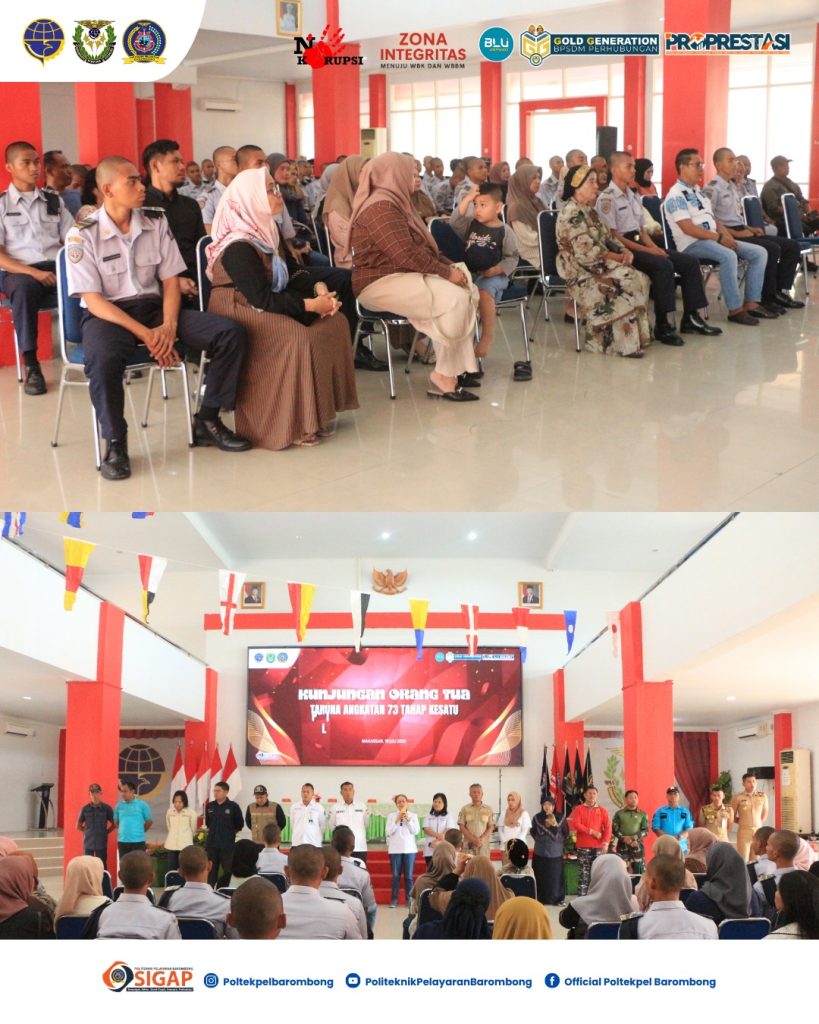 Makassar, 26 Juli 2025 – Politeknik Pelayaran Barombong melaksanakan kegiatan lanjutan Kunjungan Orang Tua/Wali Taruna bagi Taruna Angkatan 73 Tahap Kesatu sebagai bagian dari upaya penerapan pendidikan berbasis pendekatan humanis dan transparan.