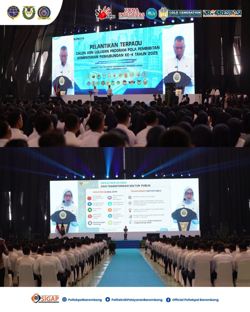 Tangerang,3 Desember 2025 – Menteri Perhubungan secara resmi melantik 2.563 lulusan Program Pola Pembibitan Tahun 2025 sebagai Calon Aparatur Sipil Negara (ASN) Muda Transportasi Indonesia, yang di antaranya 44 lulusan berasal dari Politeknik Pelayaran Barombong. Kegiatan Pelantikan Terpadu ini berlangsung khidmat dan penuh makna, menjadi momentum strategis bagi generasi baru SDM transportasi untuk mulai mengemban tugas serta memberikan pelayanan terbaik bagi bangsa dan masyarakat.