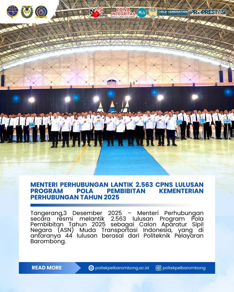 Tangerang, 3 Desember 2025 – Menteri Perhubungan secara resmi melantik 2.563 lulusan Program Pola Pembibitan Tahun 2025 sebagai Calon Aparatur Sipil Negara (ASN) Muda Transportasi Indonesia, yang di antaranya 44 lulusan berasal dari Politeknik Pelayaran Barombong.