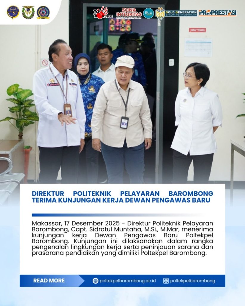 Makassar, 17 Desember 2025 — Direktur Politeknik Pelayaran Barombong, Capt. Sidrotul Muntaha, M.Si., M.Mar, menerima kunjungan kerja Dewan Pengawas Baru Poltekpel Barombong. Kunjungan ini dilaksanakan dalam rangka pengenalan lingkungan kerja serta peninjauan sarana dan prasarana pendidikan yang dimiliki Poltekpel Barombong.