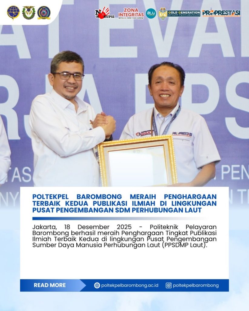Jakarta, 18 Desember 2025 – Politeknik Pelayaran Barombong berhasil meraih Penghargaan Tingkat Publikasi Ilmiah Terbaik Kedua di lingkungan Pusat Pengembangan Sumber Daya Manusia Perhubungan Laut (PPSDMP Laut).