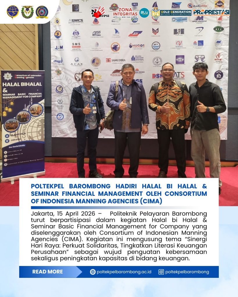 Makassar, 15 April 2026 – Dalam kegiatan tersebut, Poltekpel Barombong diwakili oleh Dr. H. Irwan, S.H., M.Mar.E selaku Wakil Direktur II yang mewakili direktur. Kehadiran beliau mencerminkan komitmen institusi dalam menjalin hubungan yang harmonis dengan para pemangku kepentingan di sektor maritim, khususnya di bidang keagenan pelaut.