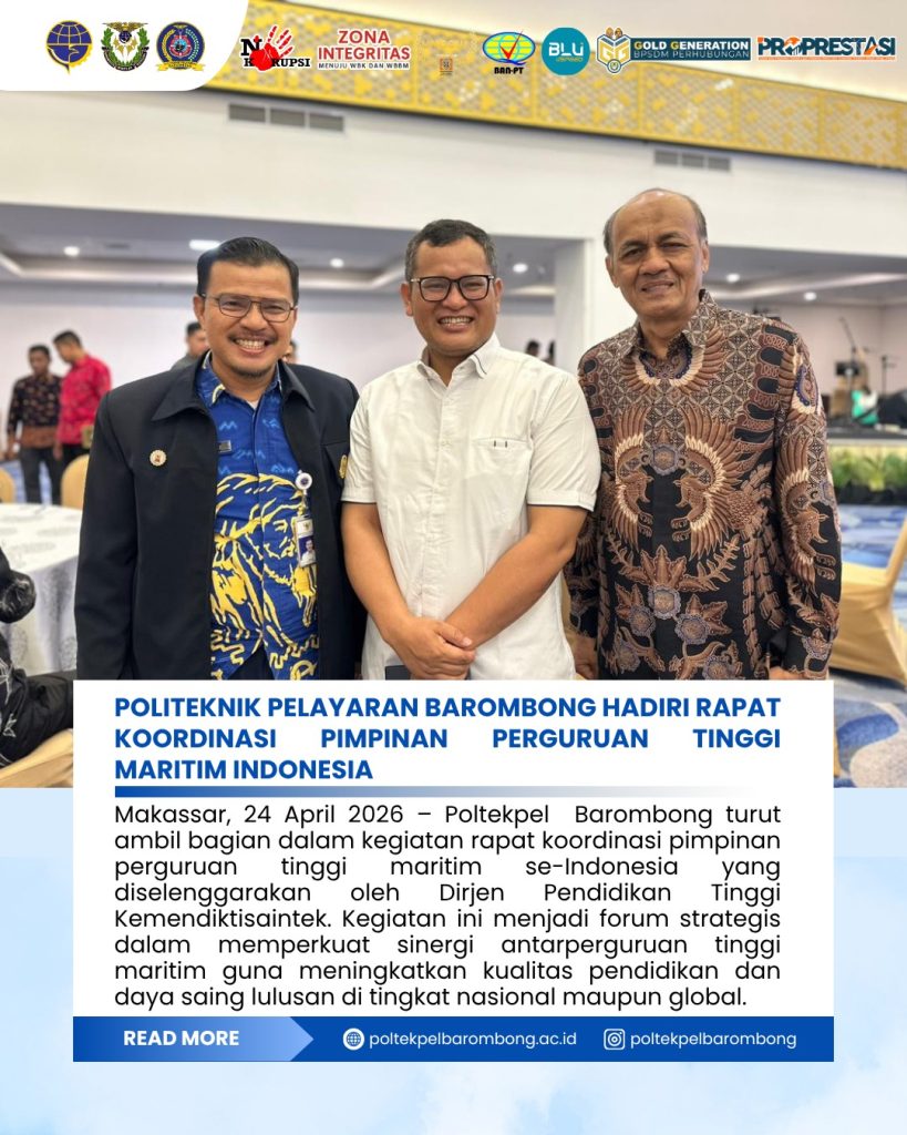 Makassar, 24 April 2026 – Rapat koordinasi tersebut dihadiri oleh para pimpinan perguruan tinggi maritim dari berbagai wilayah di Indonesia. Kegiatan ini dilaksanakan di Hotel Claro Makassar. Dalam kesempatan tersebut, Kepala Bagian Administrasi Akademik dan Ketarunaan, Dr. Ir. Supardi, M.Si., M.Mar.E., IPM., hadir mewakili Direktur Politeknik Pelayaran Barombong sebagai bentuk komitmen institusi dalam mendukung pengembangan pendidikan vokasi maritim yang adaptif terhadap kebutuhan industri dan perkembangan teknologi.